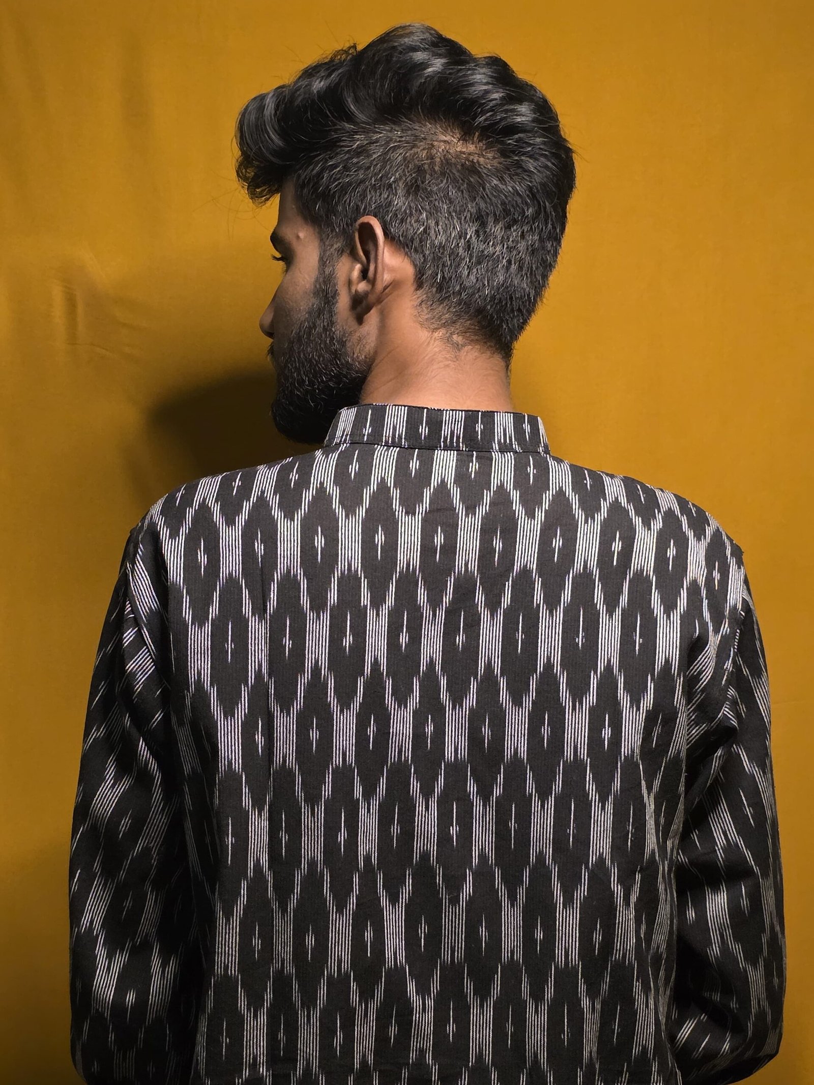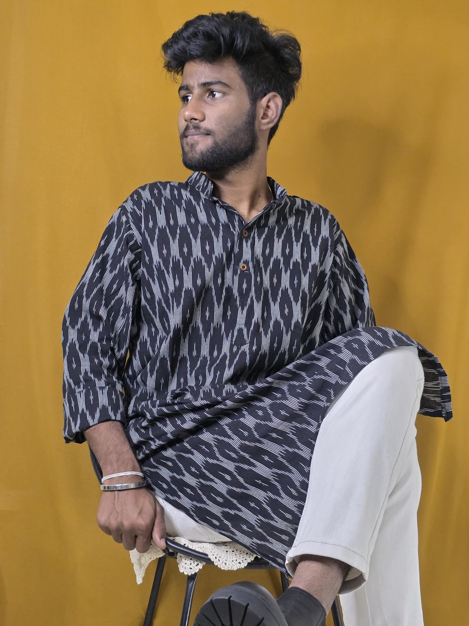Crafted in rich Pochampally Ikat, Nishka embodies timeless strength and elegance. The deep black hue speaks of confidence and quiet luxury — perfect for evening celebrations or royal gatherings. Finished with subtle handcrafted detailing, this kurta redefines festive power dressing.